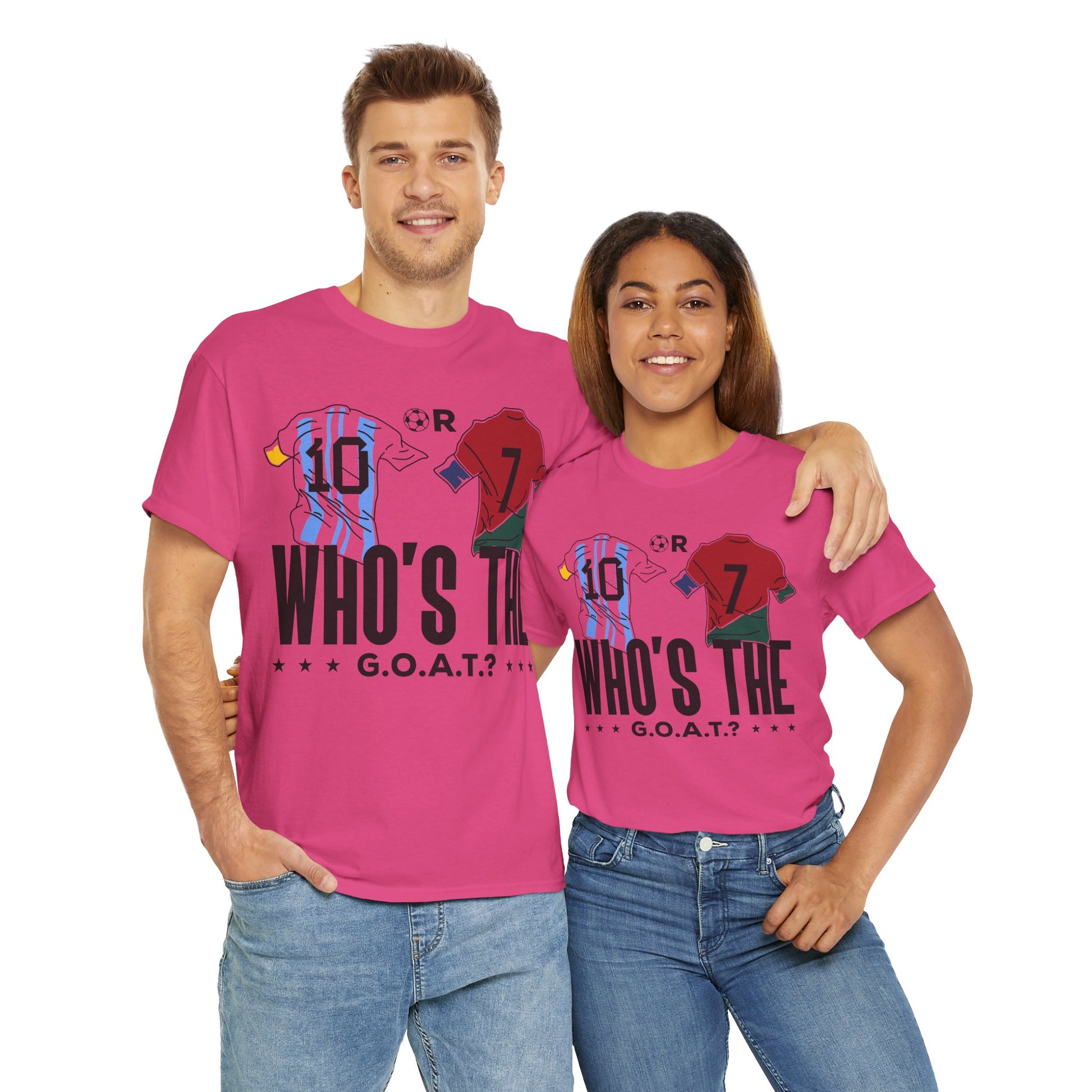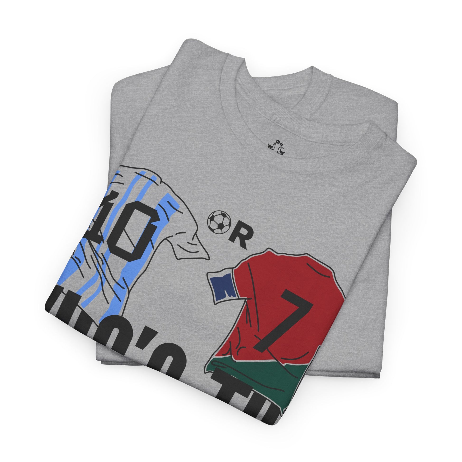 Spark the ultimate soccer debate with this bold "10 or 7 – Who's the G.O.A.T.?" tee. Featuring Argentina and Portugal flag graphics inside the numbers, this shirt lets fans rep their pick between the two football legends. A must-have for Messi or Ronaldo supporters and lovers of the greatest football rivalry of all time.