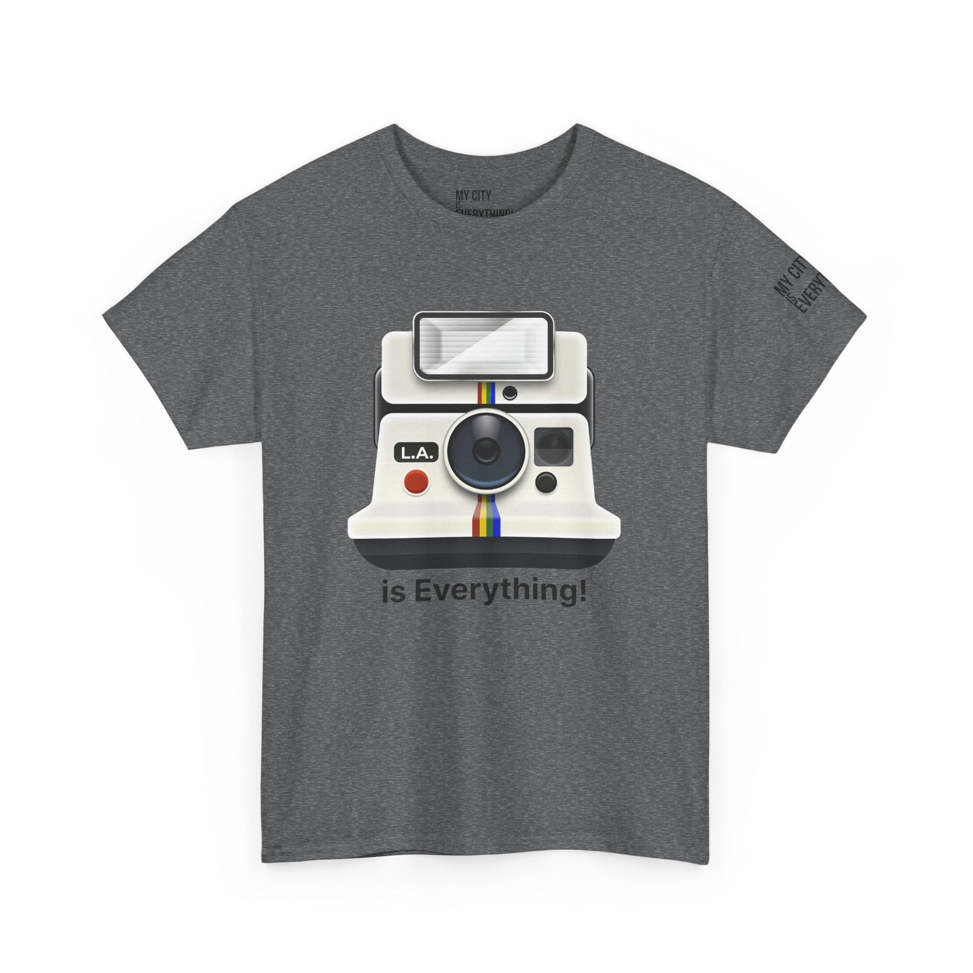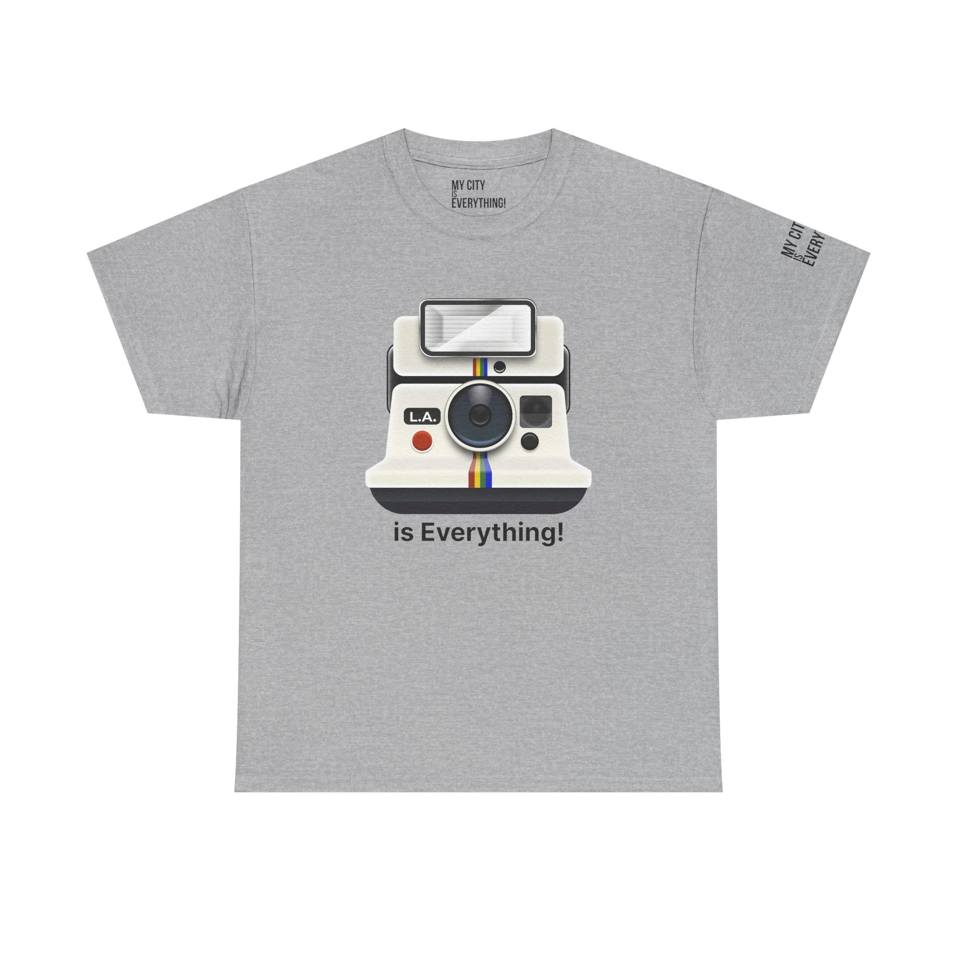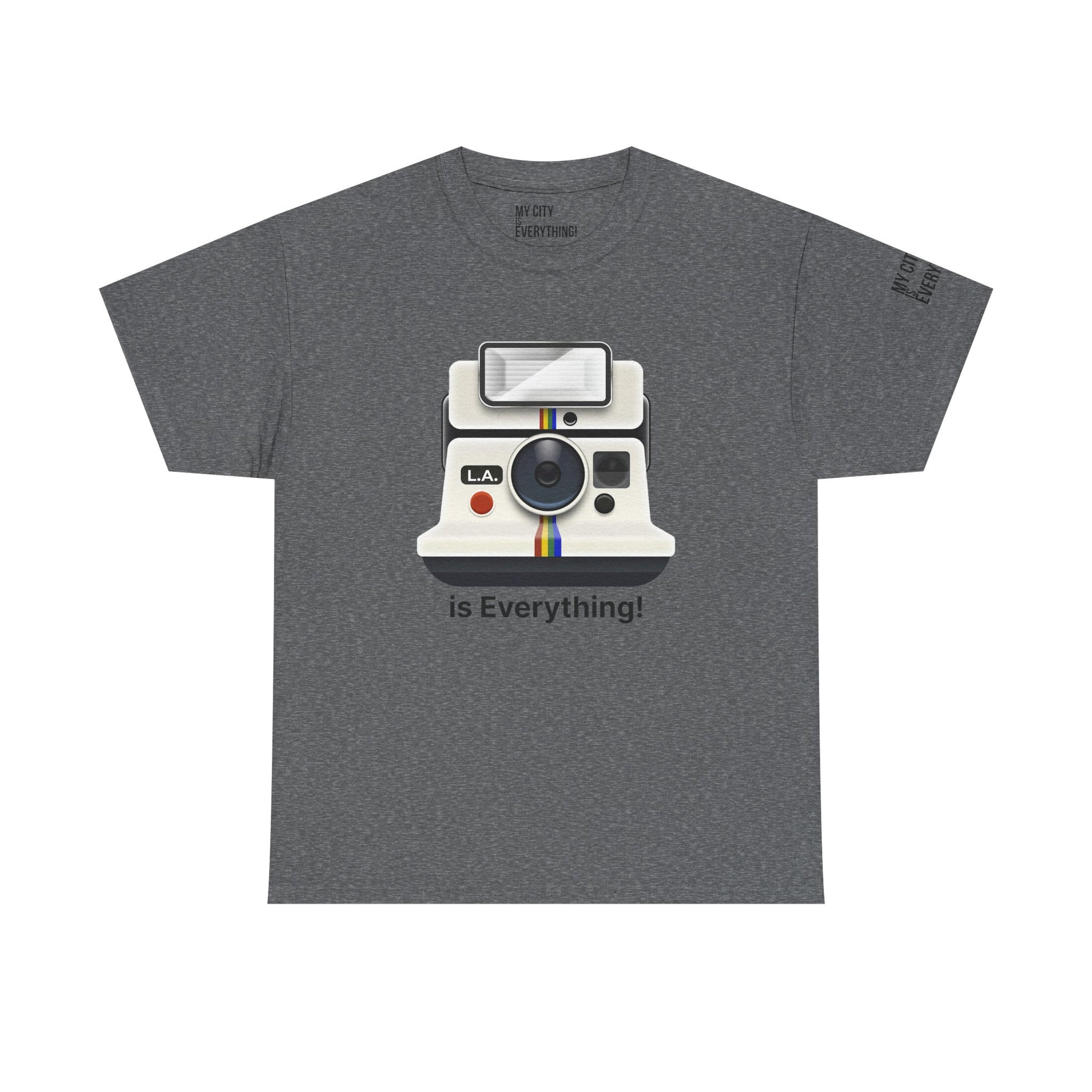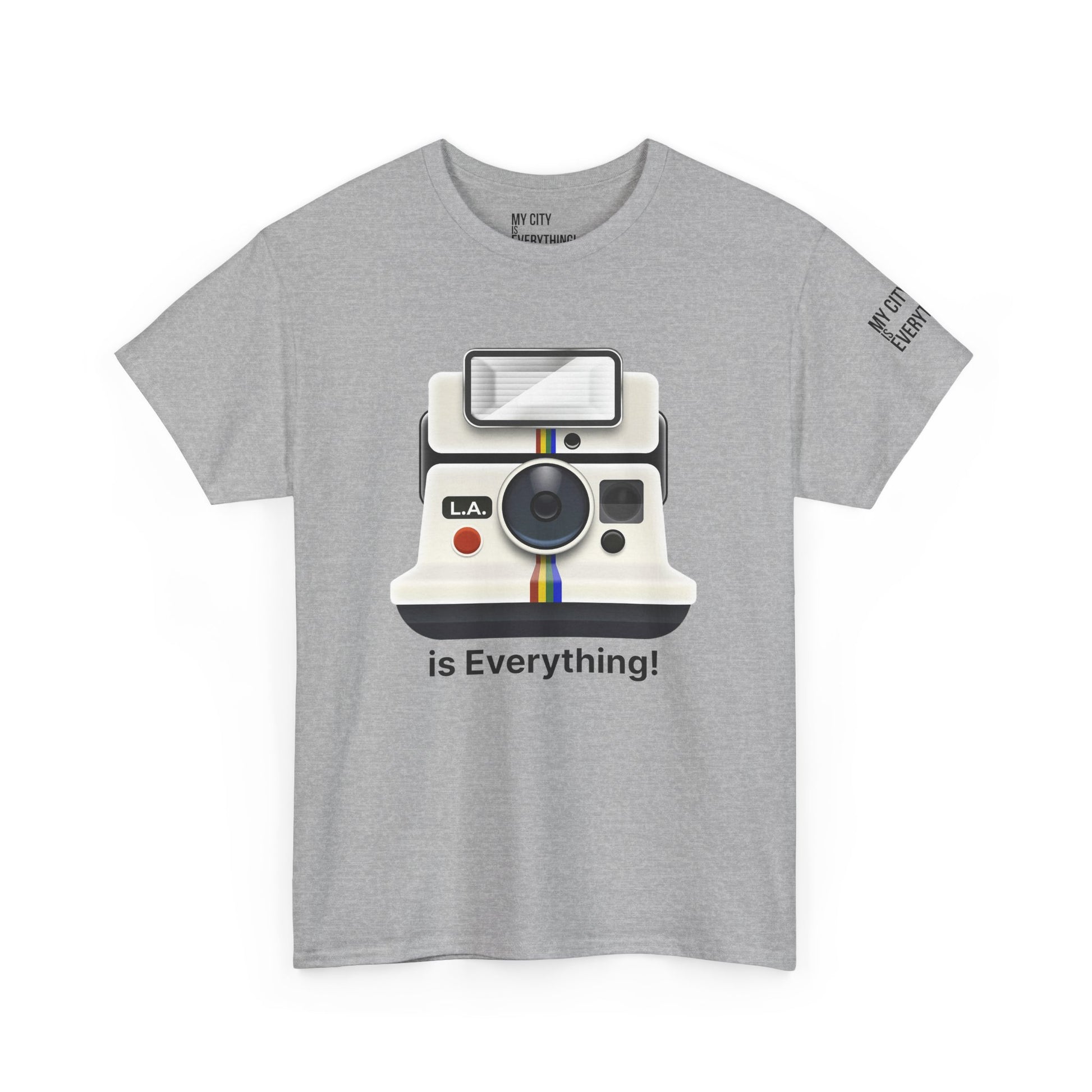 Instantly iconic. This vintage-style tee blends retro tech with West Coast pride, featuring a classic Polaroid-style camera marked “L.A.” and stamped with the bold is Everything! message. Whether you're snapping flicks on Fairfax or catching golden hour in Venice, this shirt is made for the creators and curators of Los Angeles culture. A must-have from the My City is Everything! collection — where city pride meets timeless style.