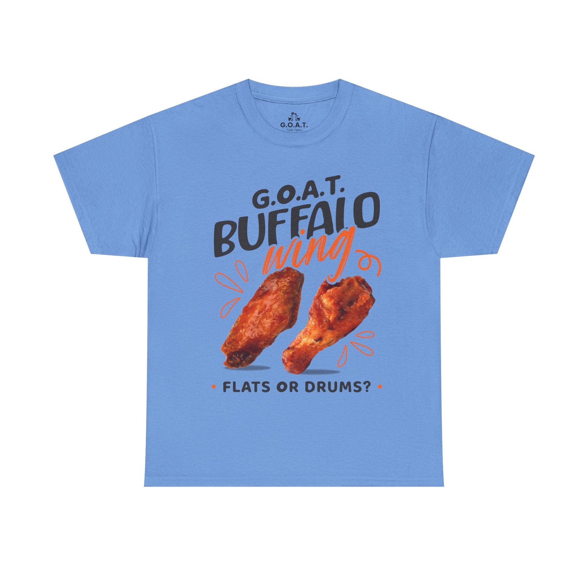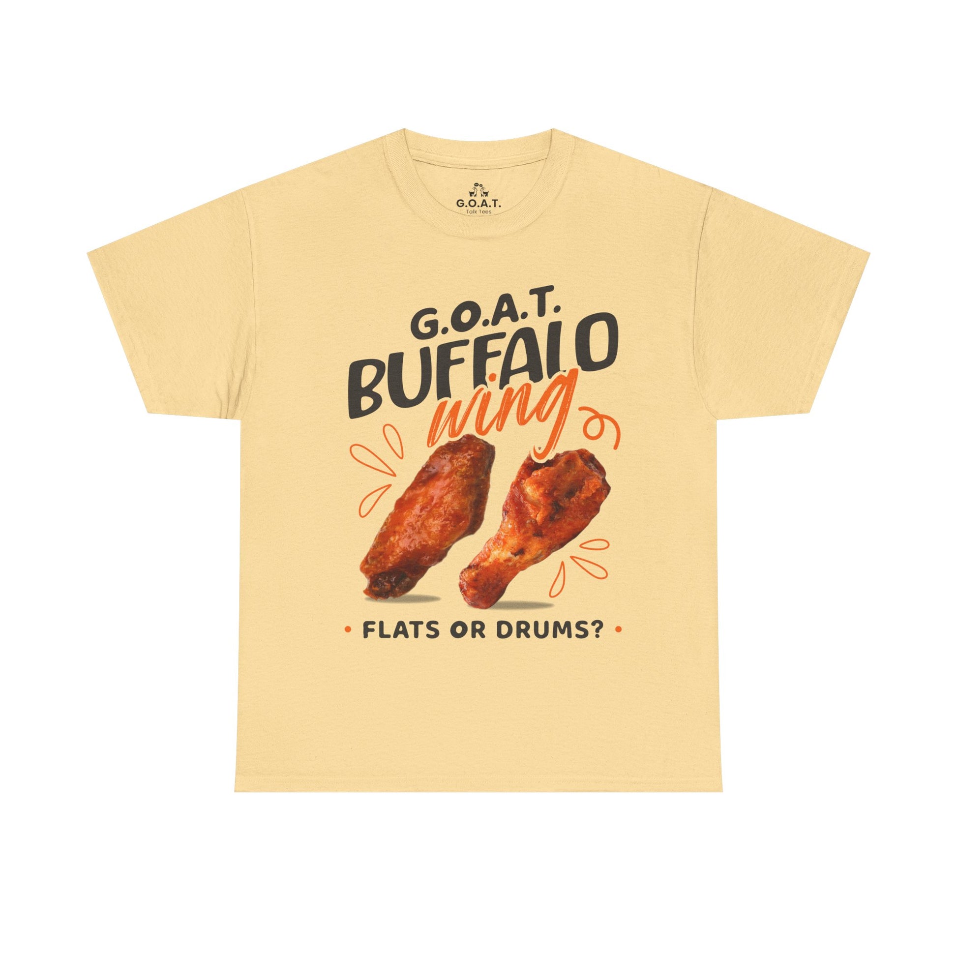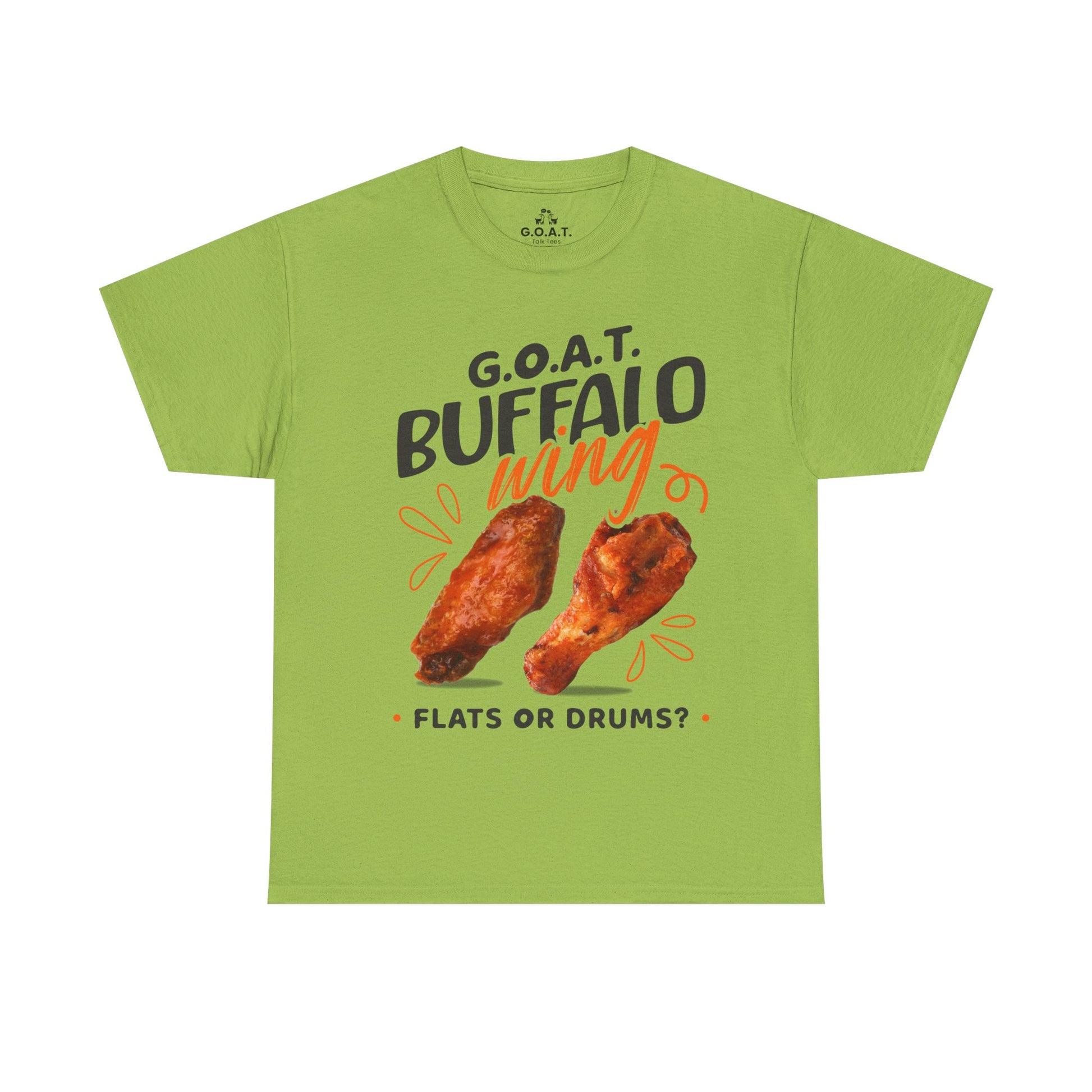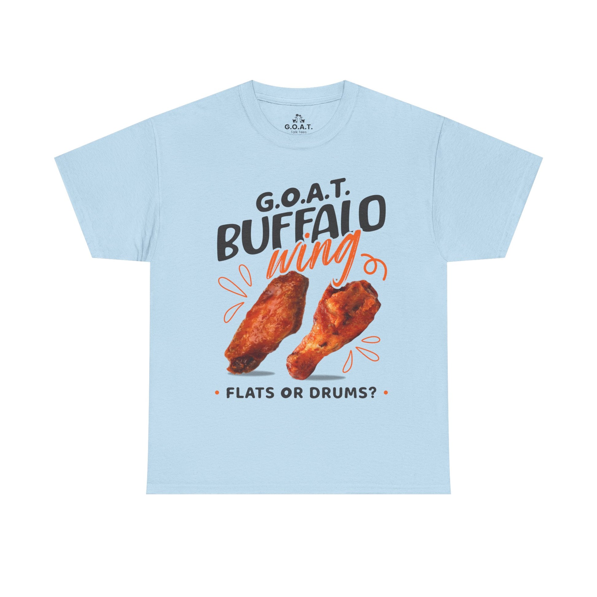 Spark the ultimate wing debate! This G.O.A.T. Buffalo Wings T-Shirt lets you rep your sideâflats or drums. Perfect for foodies, sports fans & game nights.