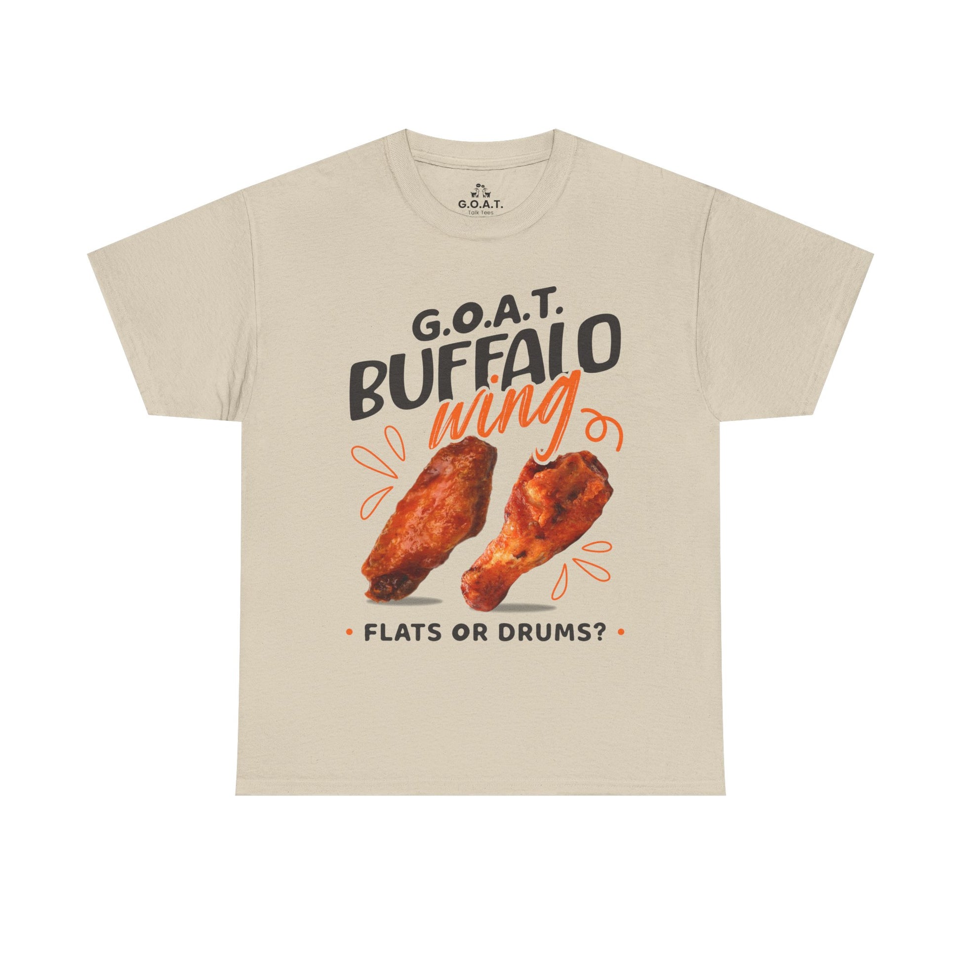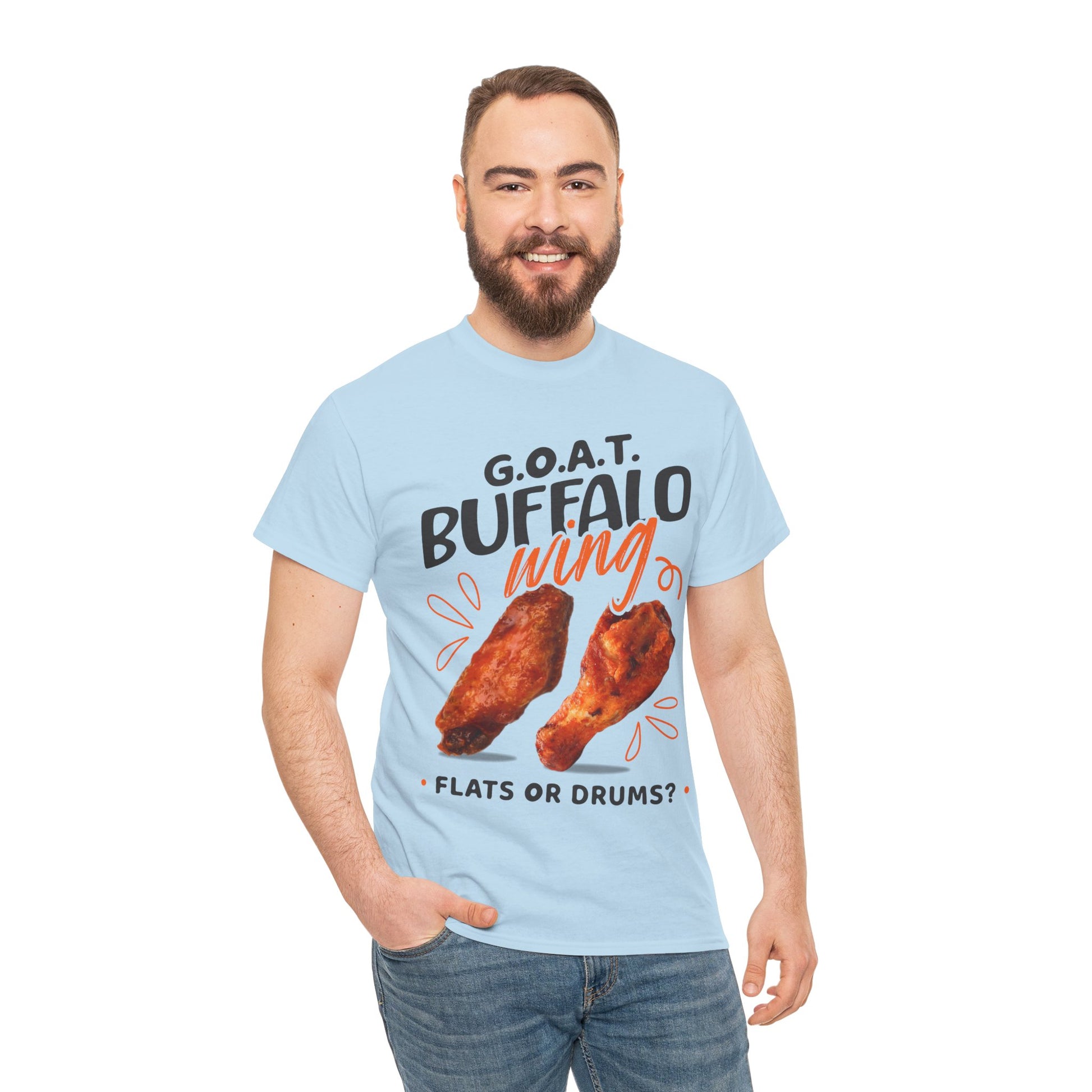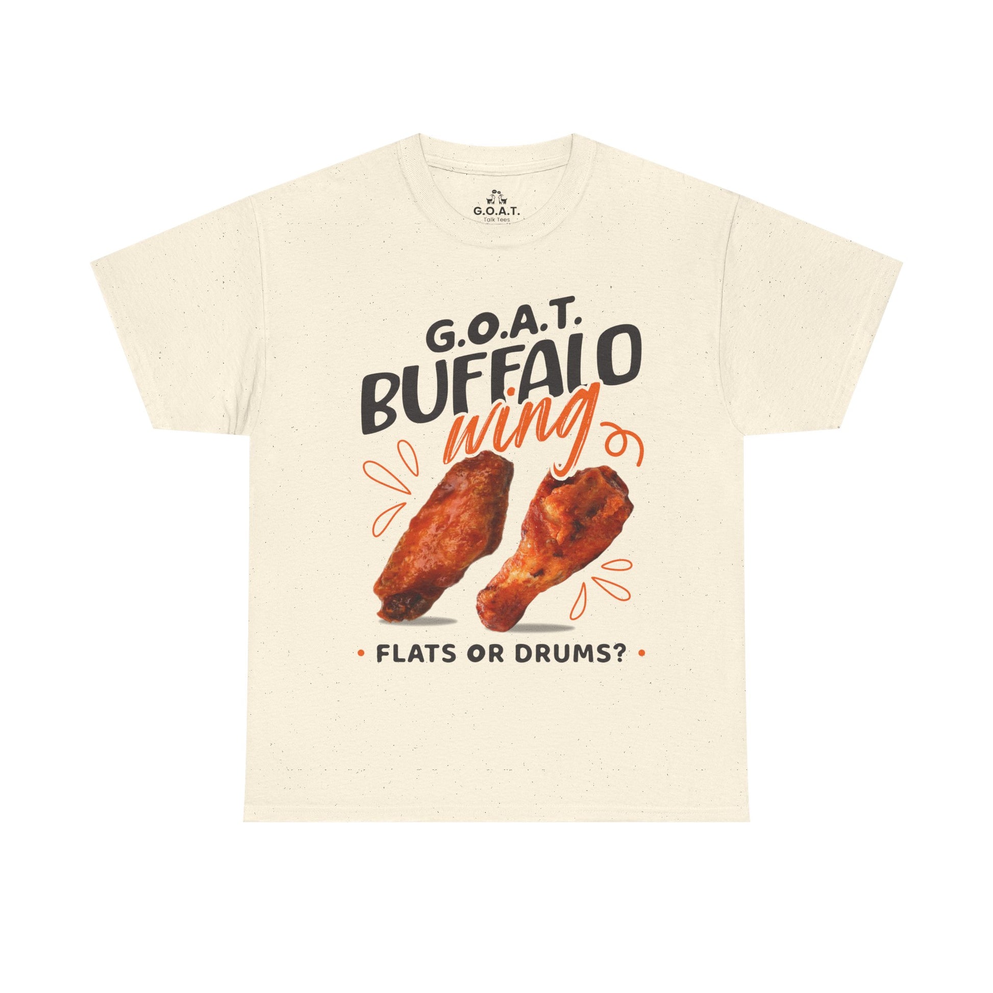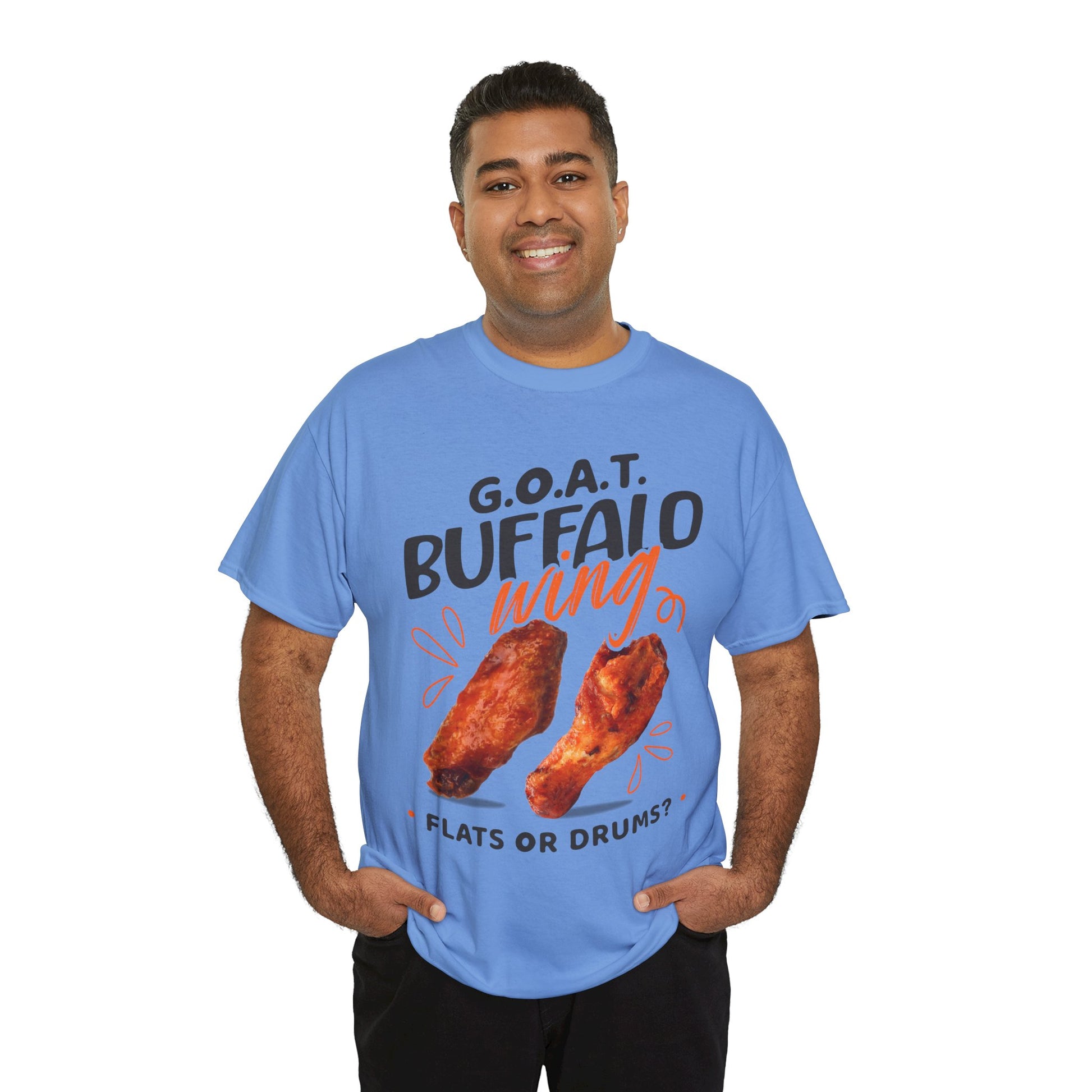Spark the ultimate wing debate! This G.O.A.T. Buffalo Wings T-Shirt lets you rep your sideâflats or drums. Perfect for foodies, sports fans & game nights.